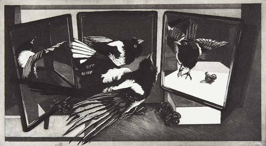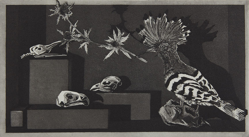 D’un point de vue technique, les rapports de l’ombre et de la lumière étaient propices à l’utilisation de l’eau-forte et de l’aquatinte, appuyant un effet de surprise, une sensation de mystère. J’ai utilisé le même procédé pour les deux séries distinctes de la Quête des oiseaux, l’une réalisée sur zinc, l’autre sur cuivre.